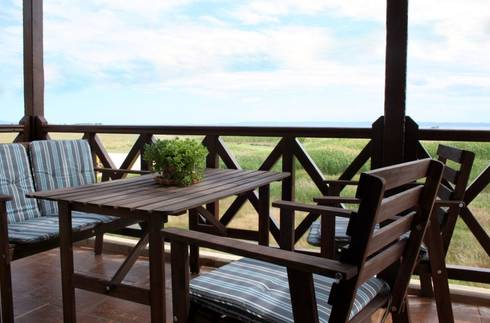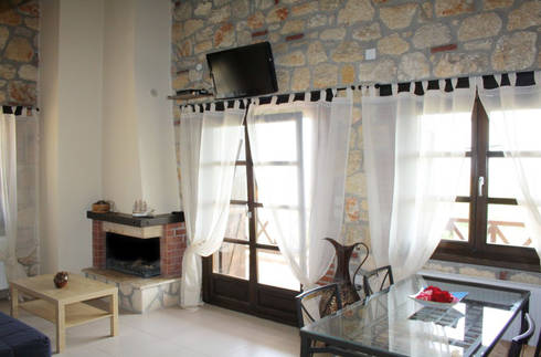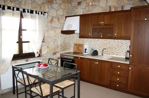 Das Haus Angelos ist ca. 80 qm groß. Der Eingang führt Sie zunächst in einen Vorraum, von dem aus es direkt ins Obergeschoß mit einem großzügigen Wohnraum und der Küche geht. Von hier aus geht es auf den großen Balkon. Dort haben Sie einen herrlichen Blick aufs Meer und die umliegenden Steinhäuser. Die Stühle und der Tisch laden Sie morgens zum Frühstücken und abends zum Wohlfühlen ein. In der gut eingerichteten Küche (Kühlschrank mit Tiefkühlfach, Herd mit Ceranfeld, Kaffeemaschine, Wasserkocher, Abzugshaube und Essgarnitur) können Sie nach Lust und Laune schmackhafte Gerichte zubereiten, die Sie dann mit Familie oder Freunden auf dem Balkon oder im Ess-/Wohnzimmer zu sich nehmen können.